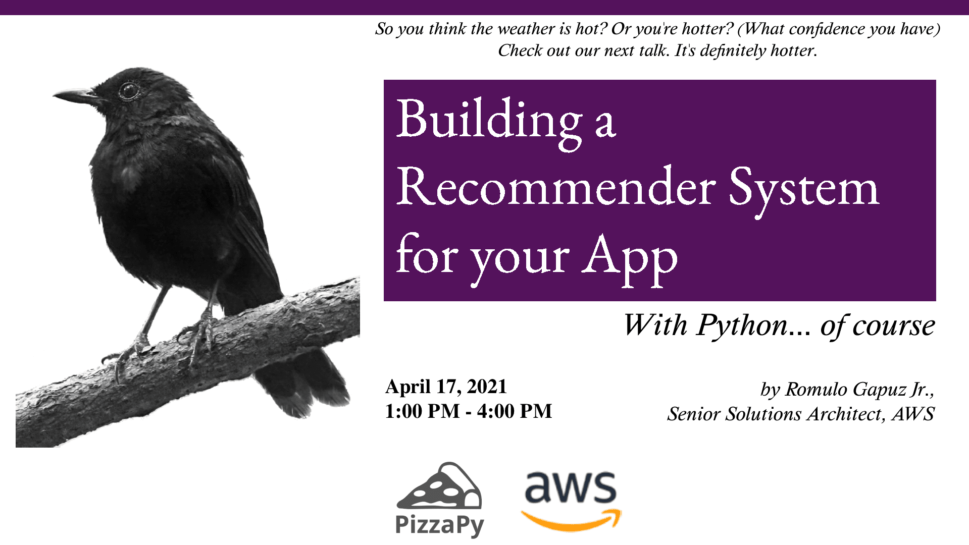 1:15 PM – 2:15 PM: TALK: “Building a Recommender System for your App” by Romulo Gapuz Jr., Senior Solutions Architect at AWS Philippines